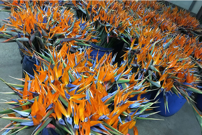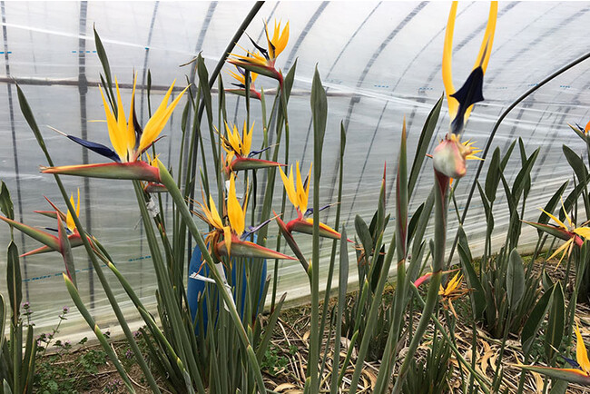 滋賀県で唯一のストレリチア生産地、東近江市大中町。例年12月~3月が出荷のピークとなり、冬枯れた田園地帯からビニールハウスに一歩足を踏み入れると、満開のストレリチアの花畑が広がります。高さ1メートルほどもあり、濃い緑色の葉のそこかしこに、カラフルな鳥たちが飛び交っているかのようです。豪華な姿と和名『極楽鳥花』の縁起の良さから、迎春の生け花や宴会のスタンド花の花材として人気があります。花言葉『輝かしい未来』の縁起の良さからお祝いの席にも需要があります。