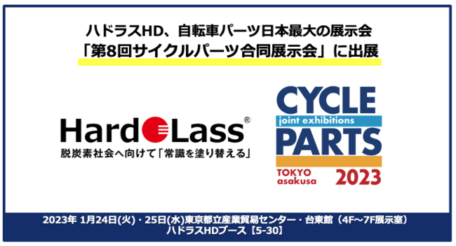 ナノマテリアルコート「ハドラス」を提供するハドラスホールディングス株式会社(本社:東京都江東区、代表:山本 英明、以下ハドラスHD)は、サイクルパーツ合同展示会実行委員会が主催する “自転車パーツ日本最大の展示会” として認知されている「第8回サイクルパーツ合同展示会」に、2023年1月24日・25日の2日間に渡り出展いたしますので、お知らせいたします。