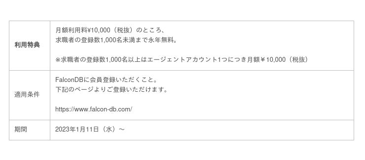 企業のDXを促進するアルサーガパートナーズ株式会社(本社:東京都渋谷区、代表取締役 /CEO・CTO:小俣泰明、以下「アルサーガパートナーズ」)は、2023年1月11日(水)より、人材紹介業者向け顧客管理システムFalcon DB(ファルコンディービー)の月額利用料を、求職者の登録数が1,000名まで無料とすることをお知らせいたします。