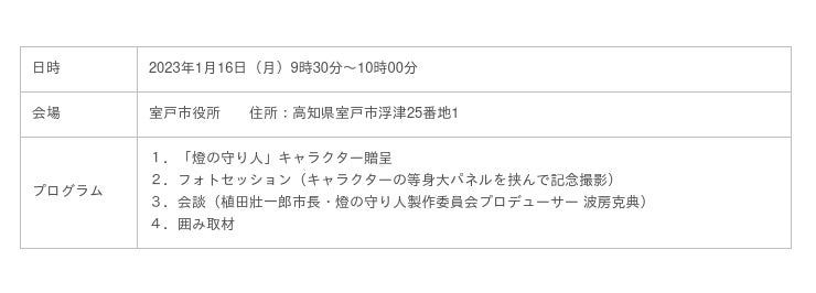 燈の守り人キャラクターを活用して、地域の灯台を歴史・文化資産として活用する機運をつくるため、キャラクター化の対象となる「室戸岬灯台」が立地している高知県室戸市の植田壯一郎市長を、「燈の守り人」製作委員会プロデューサーの波房克典が2023年1月16日(月)に表敬訪問し、キャラクターの贈呈式を実施しました。