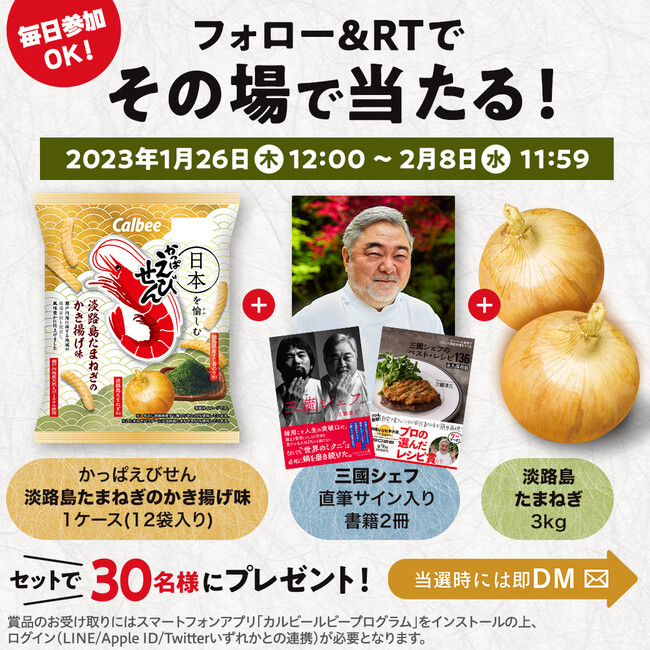 「かっぱえびせん」公式Twitterアカウントをフォローの上、キャンペーン投稿のリツイートをしていただいた方の中から抽選で『かっぱえびせん 淡路島たまねぎのかき揚げ味』1ケース+三國シェフ直筆サイン入り書籍2冊+淡路島たまねぎ3kgをプレゼントするキャンペーンを実施します。