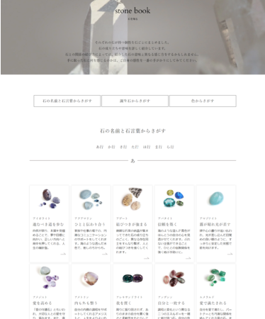 stone bookは、「石の名前と石言葉」「誕生石」「色」の3つの切り口から天然石を調べられる辞書コンテンツです。