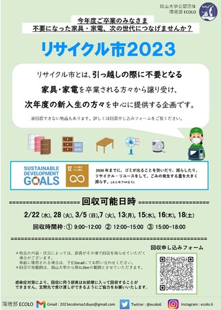 国立大学法人岡山大学(本部:岡山市北区、学長:槇野博史)の公認団体である環境部ECOLOが今年度も「リサイクル市2023」を開催します。