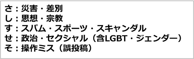 当レポートで設けているカテゴリは、SNS上で起こるリスク対応を含めたSNS運用ノウハウを体系的に学べる一般社団法人SNSエキスパート協会が提唱する「炎上さしすせそ」を元にアレンジして選出しています。