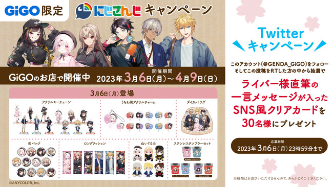 株式会社GENDA GiGO Entertainment(本社:東京都港区 代表取締役社長:上野 聖 以下当社)は、2023年3月6日(月)より、GiGOグループのお店にて、大人気バーチャルライバーグループ『にじさんじ』とコラボレーションした、『にじさんじ SNS風クリアカードプレゼントキャンペーン』を開催いたします。