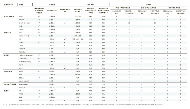 ・メガベンチャー・BtoBSaaS・AI企業・BtoBtoC事業・BtoCメディア事業・医療ITのカテゴリに分類し、代表的な企業をピックアップして、現在の求人状況を調査(※1)