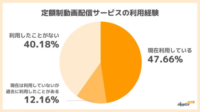 「定額制動画配信サービスを利用したことがありますか?」を尋ねたところ、「現在利用している」が47.66%、「現在は利用していないが過去に利用したことがある」が12.16%、「利用したことがない」が40.18%でした。