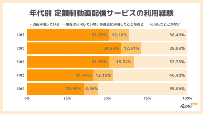 10~30代は半数以上が定額制配信サービスを利用中。利用率が最も高いのは20代。
