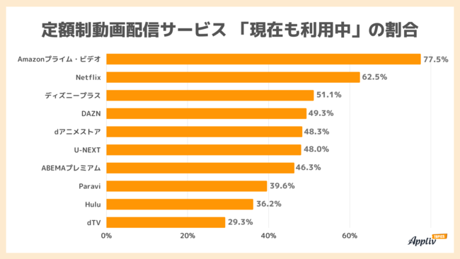 1位と2位は利用経験者数と同じく「Amazonプライム・ビデオ」「Netflix」。「Amazonプライム・ビデオ」は8割近い人が現在も利用中です。