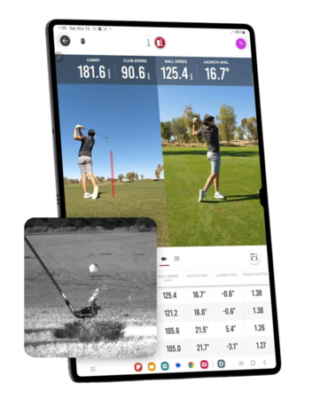 MLM2PRO™ 本体 と連動したモバイル端末からも同時に撮影ができるので、チェックしたい向きにモバイル端末のカメラを設置して、ショットデータと連動したスイングをさまざまな視点で撮影できます。
