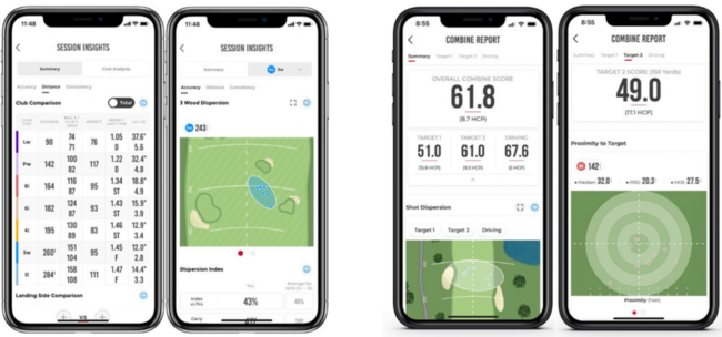ドライバーショットと2つのターゲットに対するショットから本番を想定した実力値をテストする「Combines」では、自身のスキルパフォーマンスを数値化し、確認できる機能になっています。取り組むべきことやポテンシャルを明確かつ正確に把握することができ、より効率的に練習に励むことができます。