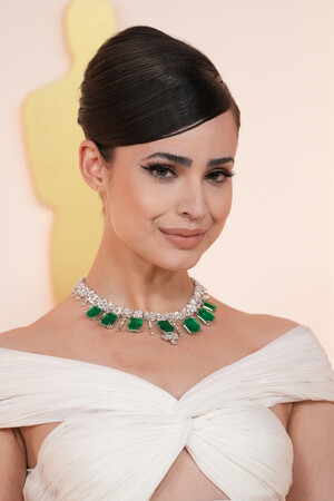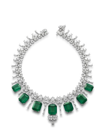 ソフィア・カーソンは合計122.49カラットのオクタゴナルカットのエメラルド7石と、合計92.57カラットのダイヤモンドをフェアマインド認証のホワイトゴールドにセットした「ハイジュエリー コレクション」のネックレスを着用。