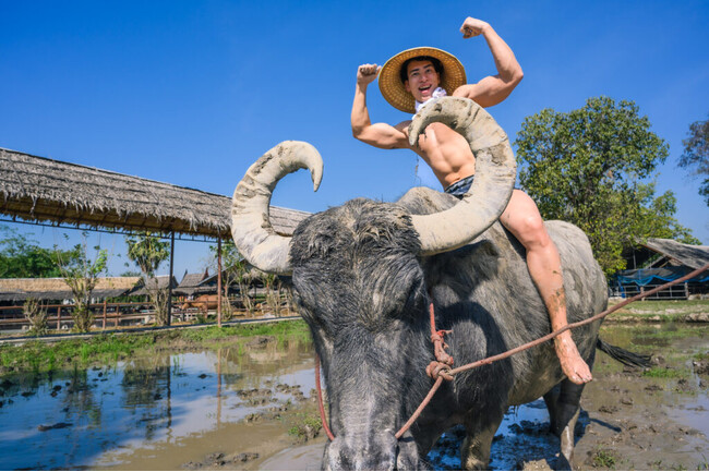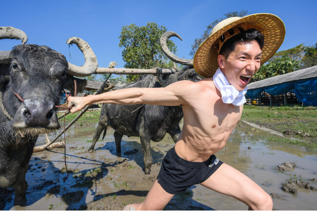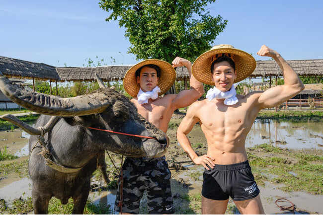 泥まみれになって田植えをするマッチョ、水牛と戯れるマッチョ、田んぼに捨てられるマッチョ(?)など、日本のマッチョたちがタイでもコミカルな写真を撮影しフリー素材として提供致します。