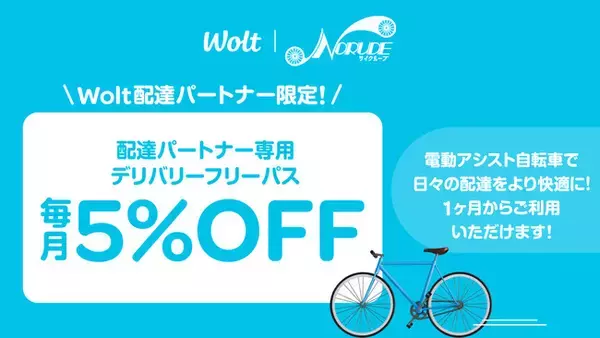 この度、電動アシスト自転車のサブスクリプション事業「NORUDE(ノルーデ)」を手がけるサイクループ株式会社(本社:東京都新宿区、代表取締役:綿谷泰宏)は、フードデリバリーサービス「Wolt Japan株式会社」のパートナーシップブランドとなりました。