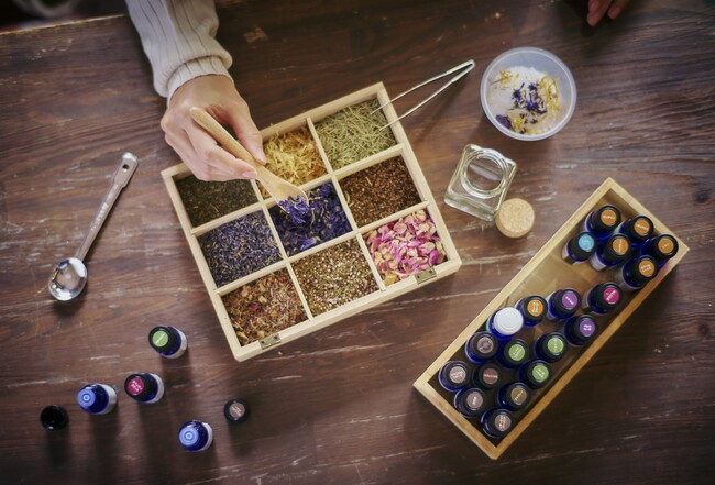 神戸布引ハーブ園がおすすめする”暮らしに役立つ精油の活用術とブレンド術”の展示も人気です。