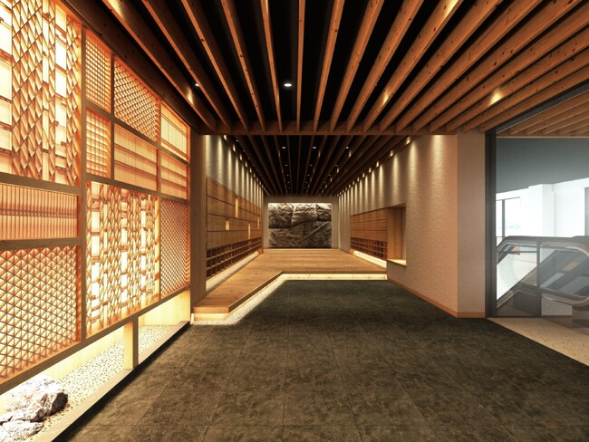 館内空間には、組子細工をモチーフにした壁面を一部採用しています。古くから日本建築に登場する文様装飾のひとつである組子細工は、木材が織りなす直線の造形美と、組子の隙間からこぼれる柔らかな光が特徴。あたたかく穏やかな空間で、旅の疲れを癒していただければ幸いです。