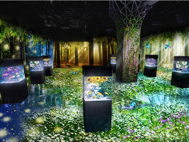 今回の目玉のひとつであるイマ―シブエリア「パターンズ」は、新緑が生い茂る初夏の森をイメージした没入空間。花の名前やカラーをもつ魚たちを鑑賞しながら、清々しい初夏の森を感じられるよう、風に揺れる花々や木々の間から差し込む光を投影します。さらに、演出に草木が揺れるサウンドも取り入れることで、生命力あふれる自然の力をより感じられる空間に。初夏を感じさせるボタニカルな雰囲気の中、水族館の生きものたちと一緒に、森林浴のようなヒーリング体験をお楽しみください。