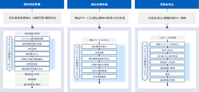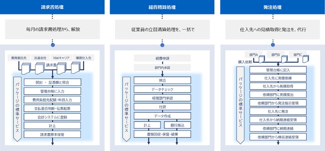 本サービスは、請求書処理、経費精算処理、発注処理、固定資産管理、前払費用処理、売掛金消込の6つの業務領域で構成され、必要なものだけを選択できる仕組みになっています。大手企業を中心とするこれまでの実績から導いた最適な定型フローがパッケージ化されており、このフローで業務省力化を図れるとともに、コンプライアンス的にも統制がとれる状態を目指すことができます。現在使用している既存サービスに納得できていない、もしくは、フルアウトソーシングにはまだ早い、と考える中小企業規模の企業をターゲットに向けて最適化されています。
