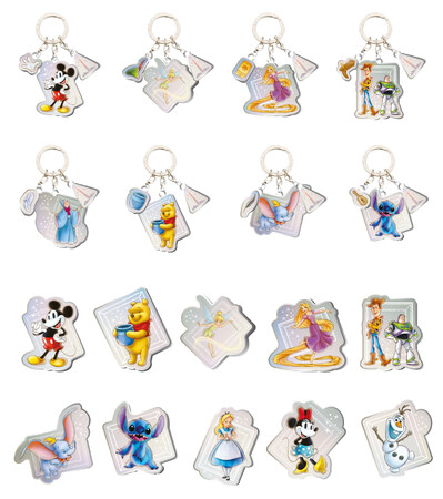 スカイツリーオリジナルのディズニー100デザインのキーホルダー。ミッキーマウス、プー、ティンカー・ベル、スティッチ、ダンボ、ラプンツェル、ウッディ&バズ・ライトイヤー、フェアリーゴッドマザーの全8種類。