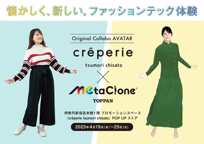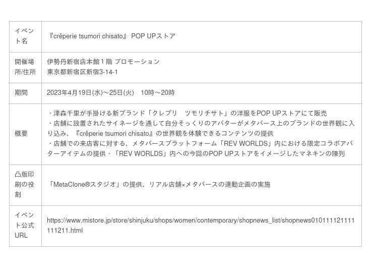 今回のPOP UPストアでは、「MetaClone(R)スタジオ」に登場するクレプリコラボアバターを、スマートフォンアプリ「REV WORLDS(※3)」内の仮想伊勢丹新宿店1階に期間限定でオープンする「クレプリ ツモリチサト × TOPPAN バーチャルショップ」に配置します。また、「REV WORLDS」内で出題されるクイズの正解者には、限定アバターウェアをプレゼントする連動企画が実施され、実際に店舗に来店することでクイズのヒントを知ることができます。