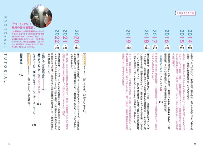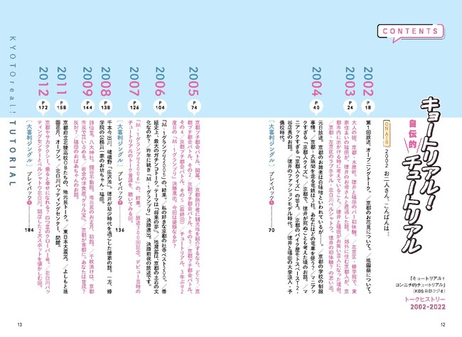 コロナをきっかけに京都にいるディレクターもついにリモートで参加。現在「キョートリアル!」は狭い一室でたった二人でおしゃべりしています。 間が怖くてしゃべくりまくりの若手時代から紆余曲折を経て、のんびり同級生トークする今に至るまでの変化を本書でお楽しみください。