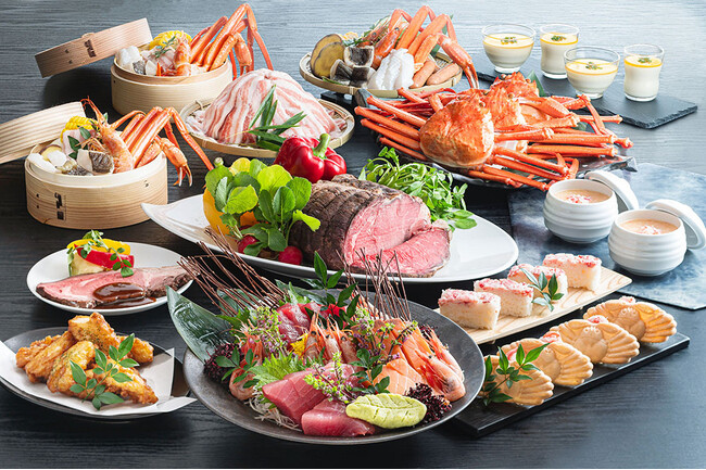 お食事は、これまで提供していた会席料理から大幅にリニューアルし、豪華メニューをご自由にお楽しみいただけるバイキング形式に変更。トリュフソースを添えた自家製ローストビーフに海鮮せいろ蒸し、さらにご当地食材を使った大山どりの炭火焼など、山陰の恵みをご堪能いただける種類豊富な料理をご用意しております。