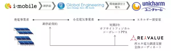 今回、アイモバイルは、耕作放棄地を活用した新設営農型太陽光発電所を、グローバルエンジニアリングとリアイバリューが構築した短期オフサイトフィジカルコーポレートPPAに活用することで、追加性(注2)のある再エネをユニ・チャームへ届けることを実現しました。