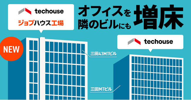 『ジョブハウス工場』をはじめとしたサービスの成長に伴う人員増加のため、Techouseは2023年5月より現在の東京オフィスの隣のビルである三田43MTビル(所在地:東京都港区三田3-13-16)にオフィスを増床します。拡張したオフィスには、『ジョブハウス工場』を運営する人材プラットフォーム事業部が主に入居し、採用活動もよりいっそう強化してまいります。