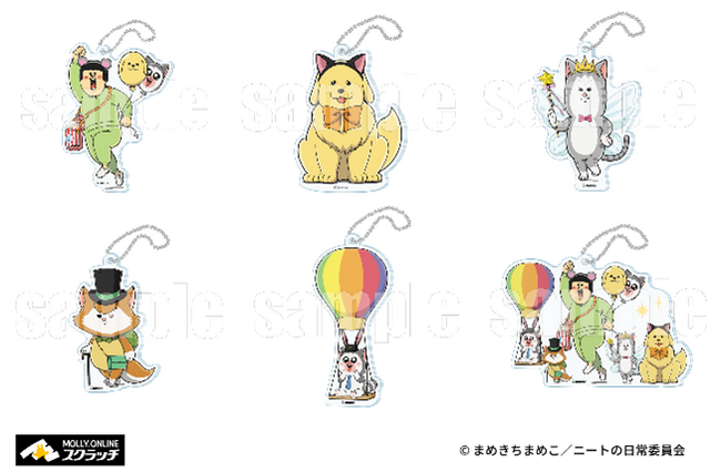 まめきちまめこ、こまち、タビ、シンバ、メロのイラストを使用したアクリルキーホルダー。
