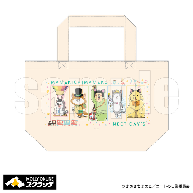 まめきちまめこ、こまち、タビ、シンバ、メロのイラストを使用したランチトートバッグ。