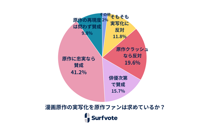 SNSとテクノロジーで社会課題の発見・解決をサポートするICTスタートアップのPolimill株式会社(ポリミル、本社:東京都港区、代表取締役:横田えり、以下Polimill社)は当社が運営するSNS、Surfvoteで2023年2月23日から2023年4月30日の期間中、「漫画原作の実写化を原作ファンは求めているか?」というテーマで意見投票を募集し、この度結果を公表しました。このイシュー(課題)はポップカルチャー観察家の岡田瑞樹氏が問題提起し、ユーザーに選択肢から自分の意見や立場に合うものを投票していただきました。投票結果の詳細とユーザーのコメント例をご紹介します。
