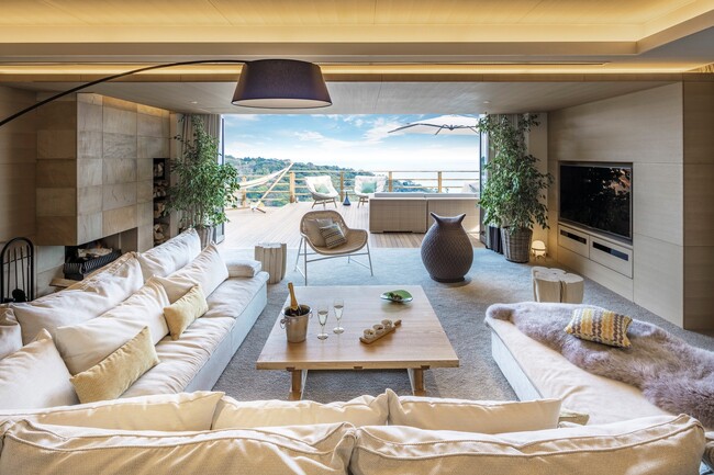 大きな窓から光がたっぷりと降り注ぎ込む開放的なしつらえが印象的な空間には、広々としたリビングやテラス、キッチン、客室などを備えます。
