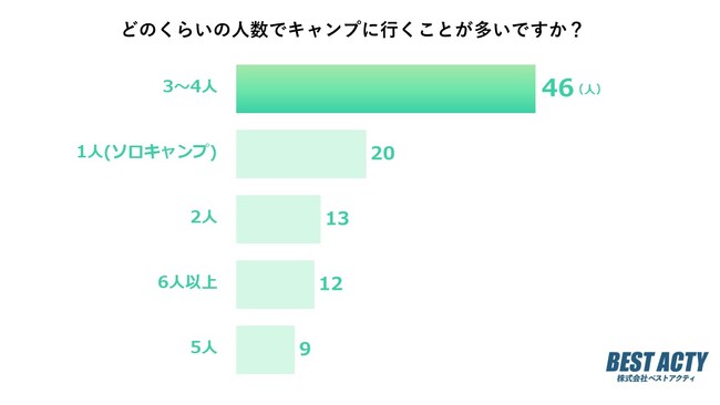 どのくらいの人数でキャンプに行くことが多いかについて100名にアンケートを行ったところ、「3~4人」と回答する人が最も多い結果となりました。