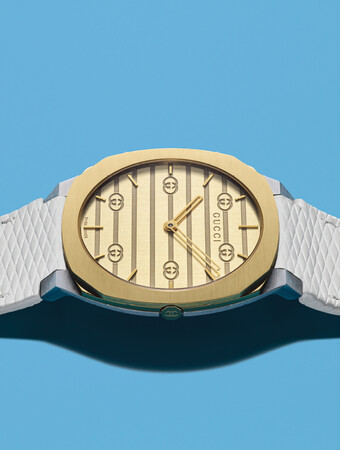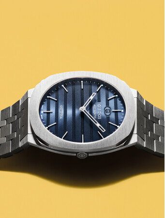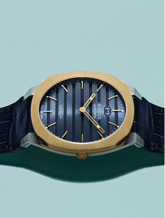 〔GUCCI 25H〕は、現代建築の洗練されたフォルムを思わせるシンプルなシルエットで、シャープで彫刻的なラインの極めてスリムなケース、リューズとベゼルの一体型のブレスレットを備えています。