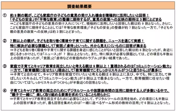 今回、イー・ラーニング研究所では子どもを持つ親を対象に「こども家庭庁発足と家庭でのキャリア教育に関する調査」を実施いたしました。その結果、こども家庭庁の子どもの意見の受け入れの機会の活用に積極的な親は約9割となりました。特に期待されているのが「子どもの安全」や「平等な教育」の整備であった一方で、実際の政策への反映に期待する親は3割にとどまりました。さらに、解決が必要な課題については「貧困」「虐待」であると認識されていることが明らかになりました。また、キャリア教育について、子育てと合わせて家庭でも取り組みたいと考える親は8割以上となり、両立に必要なこととしては「一緒に遊べるゲーム形式の教材の活用」が最も多くなりました。