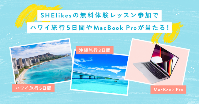 「学び」を「仕事に活かす」までをサポートし、累計7万人以上が受講する女性向けキャリアスクール「SHElikes(シーライクス)」を運営するSHE株式会社(本社:東京都港区、代表取締役CEO/CCO:福田恵里、以下SHE)は、この夏、副業への挑戦を応援するキャンペーンを7月1日(土)~8月31日(木)の期間で実施します。期間中に「SHElikes(シーライクス)」の無料体験レッスンに参加してアンケートに回答すると、ハワイ旅行や沖縄旅行、MacBook Proなどの豪華賞品が抽選で当たります。