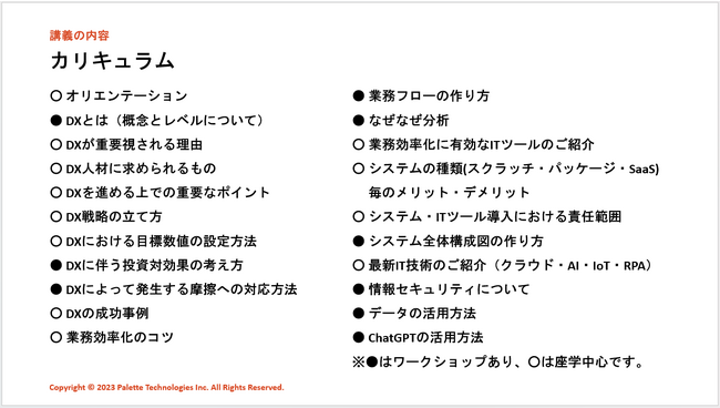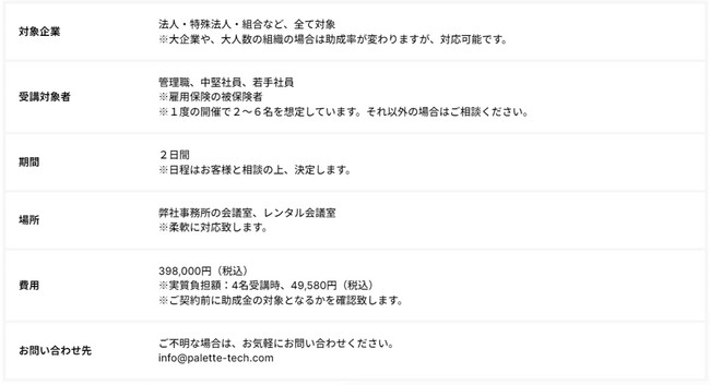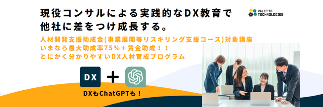 株式会社パレットテクノロジーズ(本社:奈良県奈良市、代表:阪本 翔太)は、本日2023年7月5日(水)より、人材開発支援助成金(事業展開等リスキリング支援コース)の対象講座である「実践的DX教育講座」の提供を開始いたします。