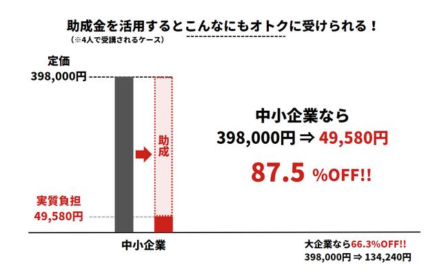 例えば、本講座を4名が同時に受講する場合、定価398,000円の受講料を、実質負担87.5%OFFの49,580円で受けることが出来ます。