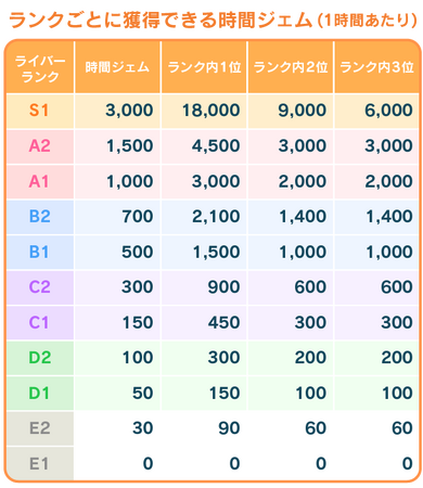 さらに、各ランクのランクスコア1~3位のライバーは、その日の「時間ジェム」が大幅にアップするボーナスが適用され、最高位のS1ランクで1位になると業界最高水準の時間報酬を獲得することができます。