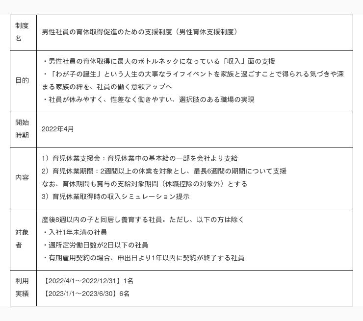 制度開始により、2022年度の男性育休取得者が6名、2023年度の取得予定者が3名と、取得を前向きに検討する社員が増えており、男性育休支援制度が男性社員の育休取得を後押ししていると実感しています。