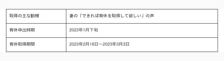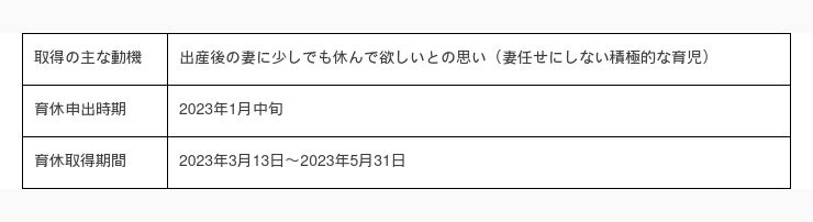 A:妻の出産予定日が近づき、「できれば育休を取得して欲しい」と妻から言われていたことが1番のきっかけでした。