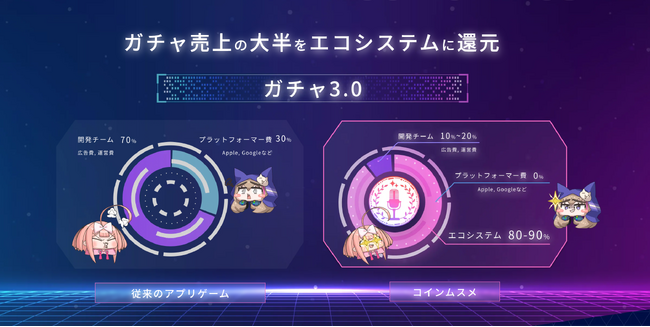ガチャ3.0とは、「ガチャなどのゲーム内売上の大半(8~9割)をエコノミクスに還元」していくことで、長期的に最高に稼げるゲームを作る、という試みです。