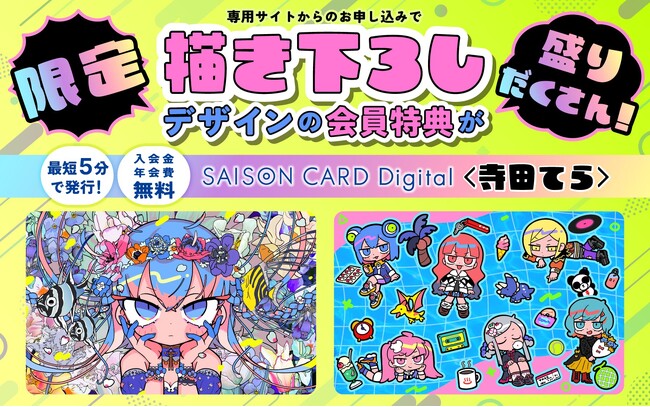 株式会社クレディセゾン(本社:東京都豊島区、代表取締役(兼)社長執行役員COO:水野克己、以下:当社)は、株式会社ストンプ・スタンプ(本社:東京都港区、代表取締役:成宮一雄)と協業し、Z世代に大人気のイラストレーター「寺田てら」とコラボレーションしたクレジットカード「SAISON CARD Digital」の申込受付を2023年8月1日(火)~12月31日(日)の期間限定で実施します。