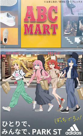 株式会社エービーシー・マート(本社:東京都渋谷区、代表取締役社長:野口実)は、アディダスの新作スニーカー「PARK ST」にて、話題のTVアニメ「ぼっち・ざ・ろっく!」とコラボしたキャンペーンを2023年8月10日(木)より開始します。また、同日より「PARK ST」を履いた「結束バンド」のメンバーを描いたABC-MART限定のオリジナル描き下ろしイラストを公開します。