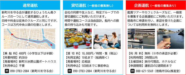 NPO法人新町川を守る会が運航するひょうたん島クルーズの一つとして運航します。