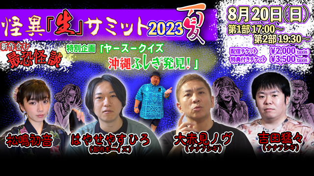 2部構成として開催されるイベントでは、他のイベントでは語られない貴重な怪談を各部で披露しながら、今回は出演が叶わなかった“沖縄随一”ユタの血を引く霊視芸人・ヤースーのロケ特別企画 「ヤースークイズ 沖縄ふしぎ発見!」にも注目したい。