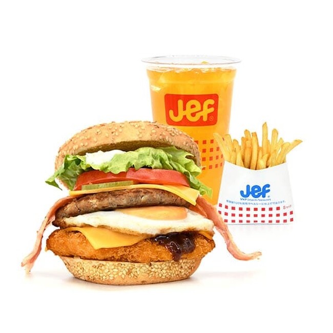 ジェフは、沖縄生まれ沖縄育ちのファストフード店として、沖縄らしさや沖縄の食材を生かしたメニュー開発を心掛けており、今回は、沖縄独自の文化のひとつでもある食堂メニューに注目しました。沖縄の食堂にはAランチ、Bランチ、Cランチという洋食プレートの定番メニューがあり、そのワンプレートのハンバーガー化に取り組みました。
