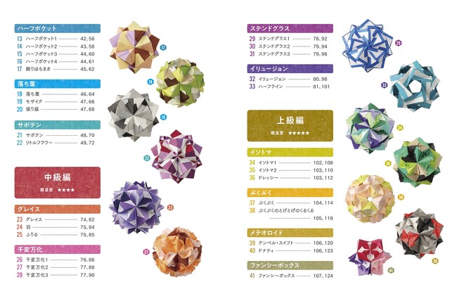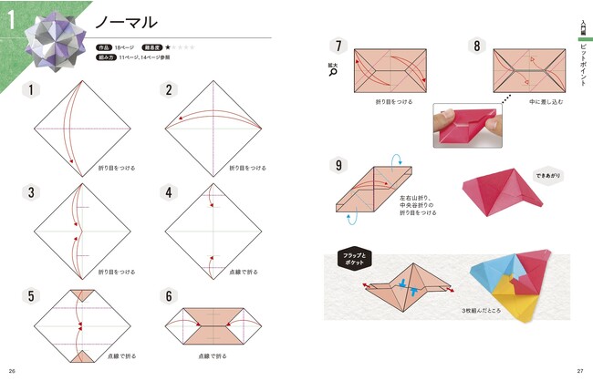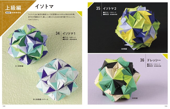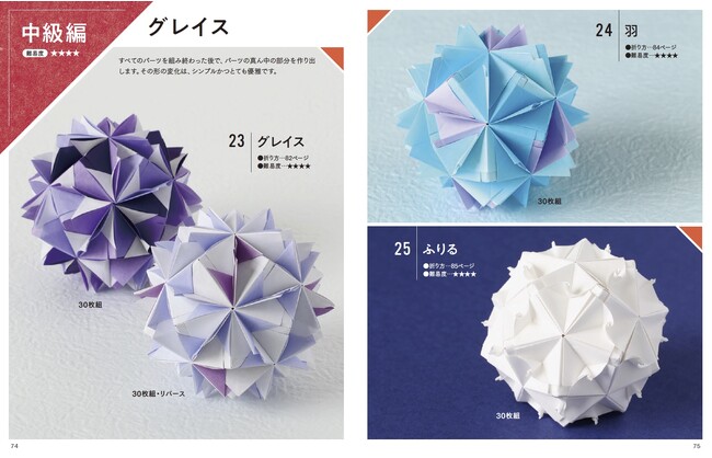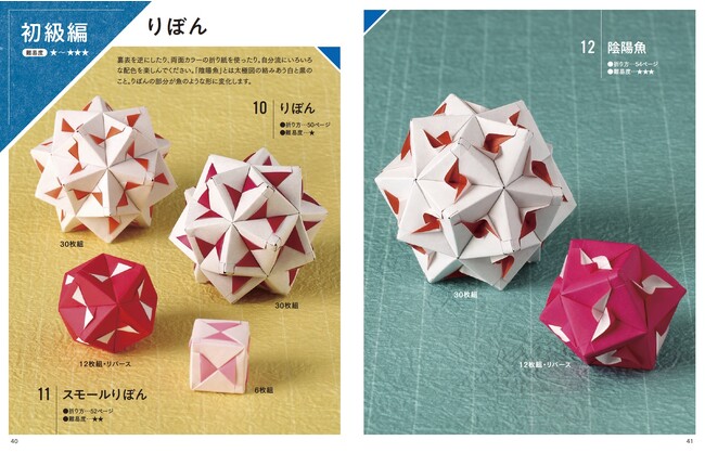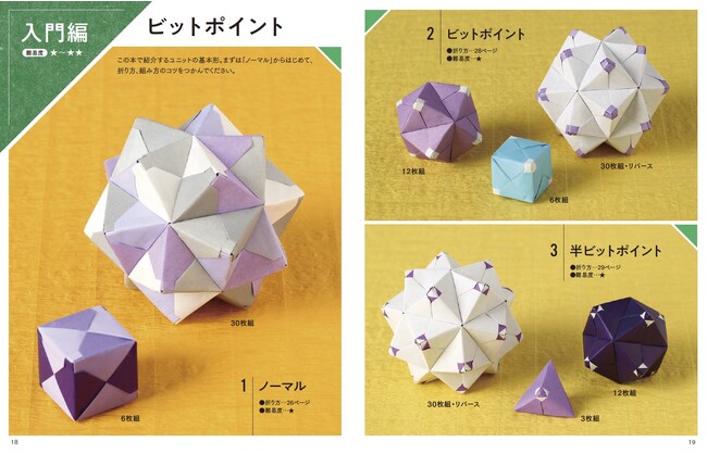 また組み方の基本を理解しやすい構造ながら、美しい完成形の作品ばかり。配色を変えたり、紙質の違うものを使ったり、新しい美しさに出会えます。「誰でもかんたんに挑戦しやすい」1冊です。