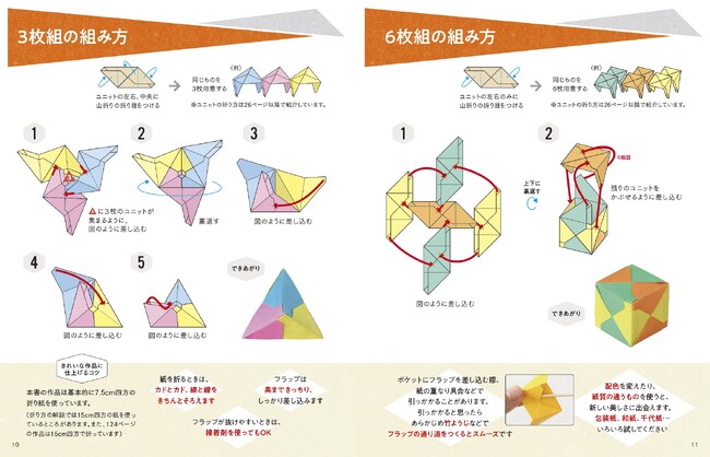 本書はオールカラーで簡潔・立体的な大きな図がわかりやすく、パーツの折り方はもちろん、3枚、6枚、12枚、30枚の組み合わせ方もとてもイメージしやすいのが特徴です。すっきりしたレイアウトは見やすく、手順に悩むことはありません。