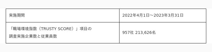 テックタッチ株式会社(本社:東京都港区、代表取締役:井無田仲、以下 当社)は、企業の健康管理支援を手がける株式会社ドクタートラストが提供する「ストレスチェック」のうち、職場の雰囲気の良さと生産性の高さを示す「職場環境指数(TRUSTY SCORE)」の分析結果にて、957社(約21万名)中2位を獲得したことをお知らせします。